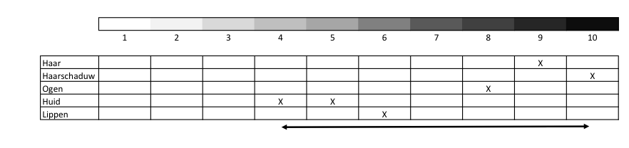 Je beschikt over een medium contrast als je waarden overheen de verschillende delen een beetje verspreid liggen over het midden de schaal, dus niet bij de uitersten. Deze middencategorie kan een middelmatige hoeveelheid contrast aan. En belangrijk is dan ook dat zij zeker voldoende contrast toevoegen, want anders zal hun gelaat onvoldoende uitstraling krijgen.