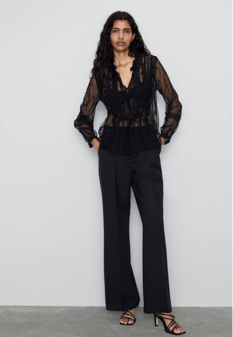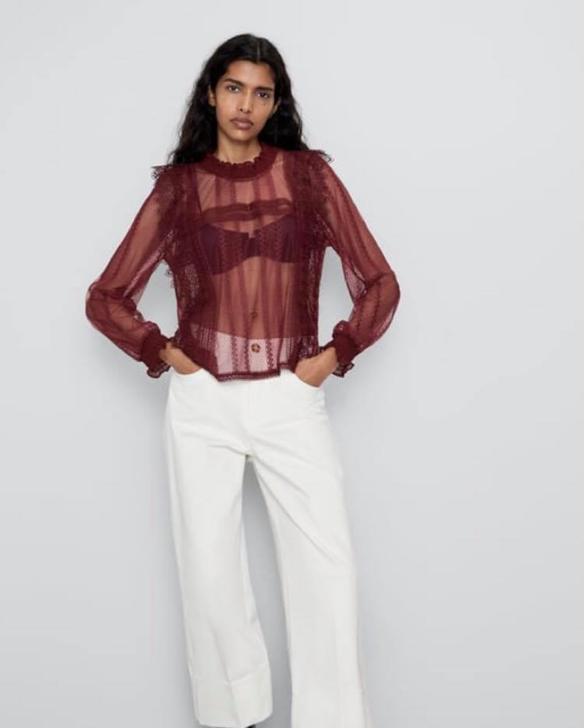 Het spreekt voor zich dat een volledig doorzichtige jurk of top vraagt om een onderstuk in de vorm van een topje of onderjurk om het geheel draagbaar te maken voor het dagelijks leven. Kies in dat geval telkens voor een onderstuk in dezelfde kleur als het kledingstuk om het tot een mooi geheel te maken. Durf je echter het see through effect iets harder op te wekken dan kan je kiezen voor een onderstuk in huidskleur of voor een bralette. Een bralette is een half topje, dat enkel de boezem bedekt en vaak mooi afgewerkt is met kant. Is echter dit alles nog steeds te veel see through voor jou, ga dan voor enkel see through mouwen. Naast de ‘echte’ see through vind je namelijk ook veel bloesjes die enkel de mouwen in see through hebben. Heel vaak zijn dit enorme pofmouwen waardoor je ze moeilijk onder een jasje of trui kan steken, doe dit dan ook niet.